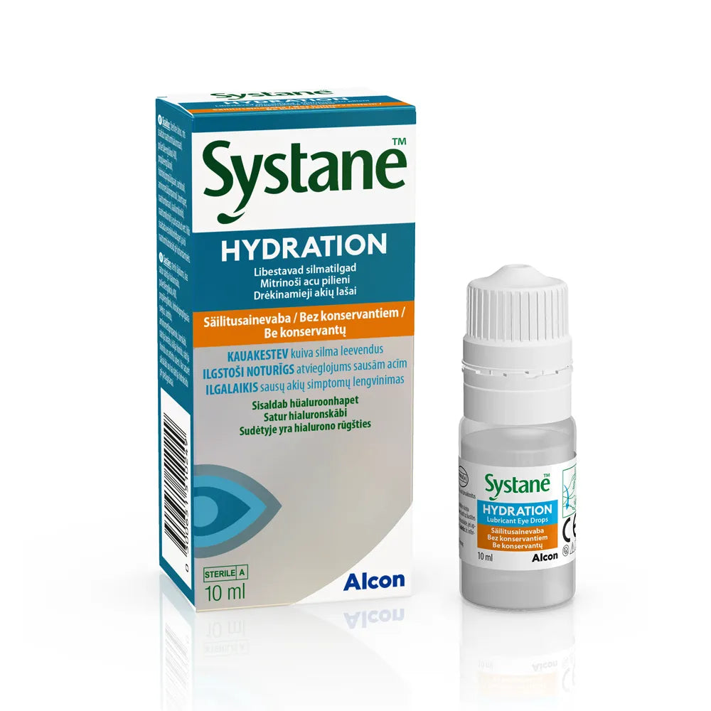 SYSTANE HYDRATION -kosteuttavat silmätipat lievittävät nopeasti ja pidempään kuivasilmäisyyden oireita, kuten ärsytystä ja polttelua, kuivuutta, väsymystä, kutinaa, punoitusta, hiekkakiven tai vierasesineen tunnetta lisätyn hyaluronihapon ansiosta. Sopii piilolinsseille. Säilyy 3 kuukautta avaamisen jälkeen